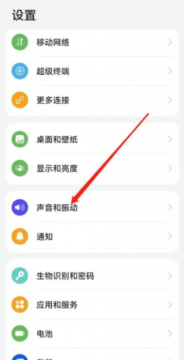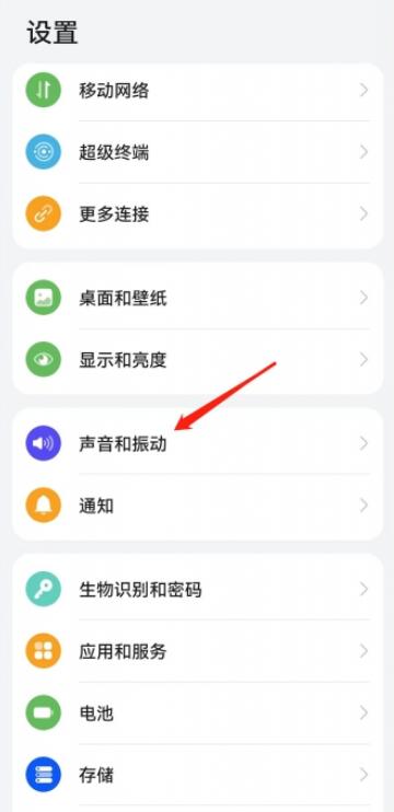 第一步:打开【设置】功能,在主设置页面选择【声音和振动】功能;