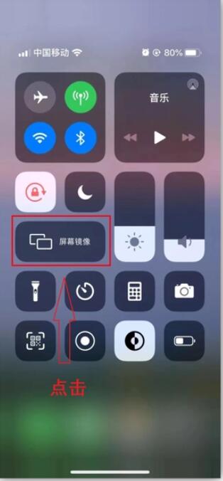 1.第一步:解锁手机,向上滑动进入控制中心选择【无线投屏】功能;