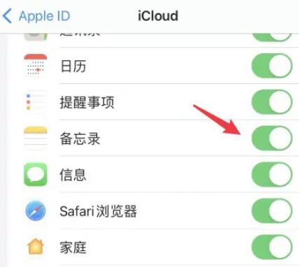 3、第三步:在最新的iCloud中找到【备忘录】后面的图标,滑动即可导入到新手机中。