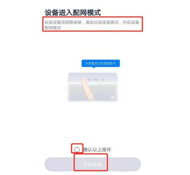 3. 步骤3:按住静音按钮直至指示灯亮起并提示您连接到网络。在手机上点击【确认以上操作】、【开始连接】;