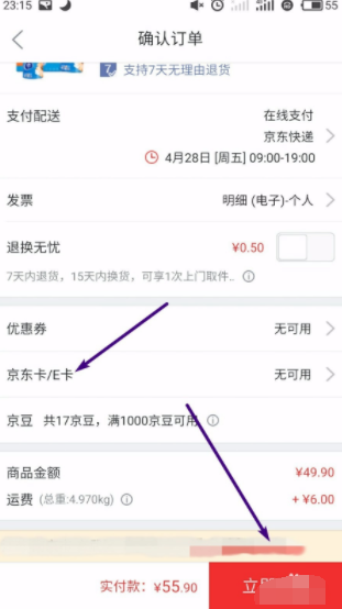 5.最后我们可以使用京东e卡支付购物费用,但只能购买大部分京东自营产品。