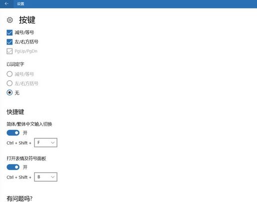 3、此外你也可以通过快捷键的方式打开表情及符号面板。顺序为设置→时间和语言→区域和语言→中文(中华人民共和国)→选项→微软拼音→选项→按键→打开表情及符号面板按钮。