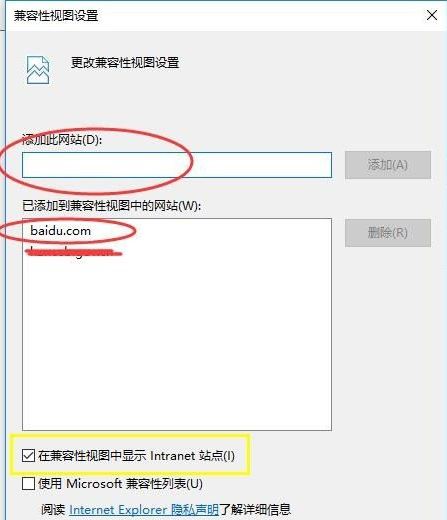 2、弹出兼容性视图设置窗口,将网址添加进来,并勾选上 在兼容性视图中显示Internet网站(默认是勾上的),然后关闭即可。