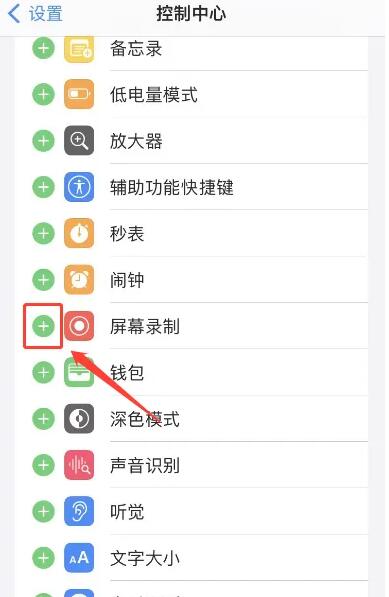 2、然后进入控制中心,点击【屏幕录制】左侧的+号进行添加;