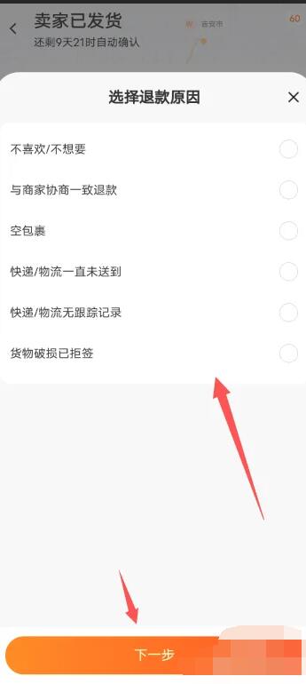 4.然后选择您需要退款的原因,点击【下一步】选项;