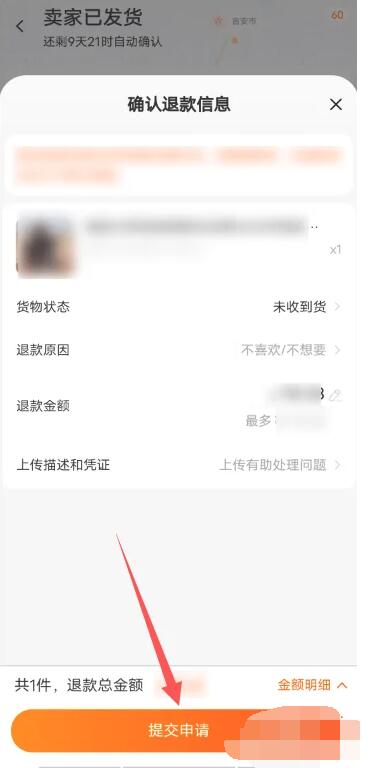 5、最后查看订单信息,点击【提交申请】功能即可获得退款。