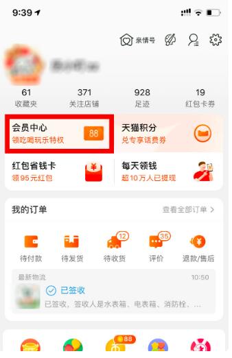 2、然后在我的淘宝区找到【会员中心】功能并点击;