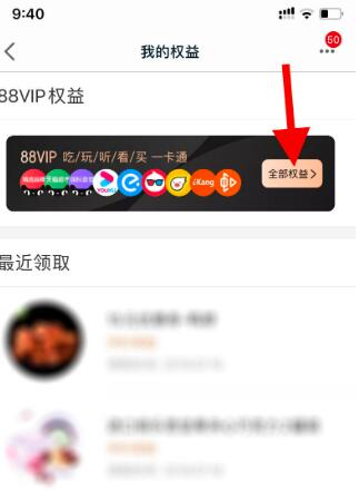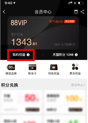 3、然后进入会员中心页面,点击【我的权益】选项,如下图;