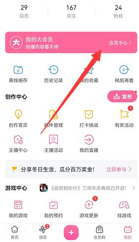 1、首先打开哔哩哔哩APP进入主页面,点击我的专区,点击【会员中心】如下图;