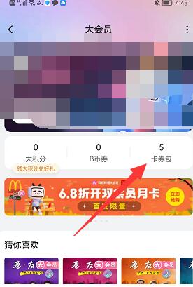 2、然后进入大会员页面,点击【卡卷包】选项进入;