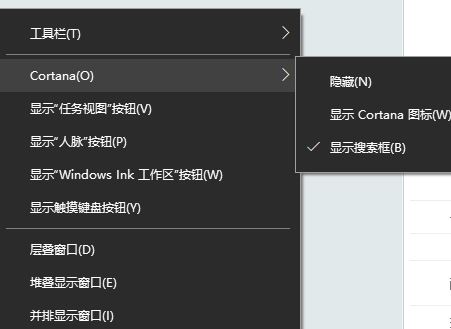 任务栏空白处单击鼠标右键,在弹出菜单中,鼠标指向“Cortana”,然后点击勾选次级菜单中的“隐藏”,就可以隐藏小娜了,如果点击勾选“显示Cortana图标”会显示小娜图标,同理,勾选“显示搜索框”会显示那个长条的搜索框。