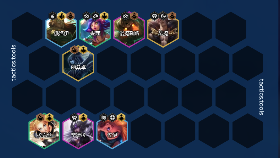 阿狸(1)+拉克丝(2)+妮蔻(2)+俄洛伊(3)+佐伊(3)+辛德拉(4)+冰雪女王丽桑卓(5)