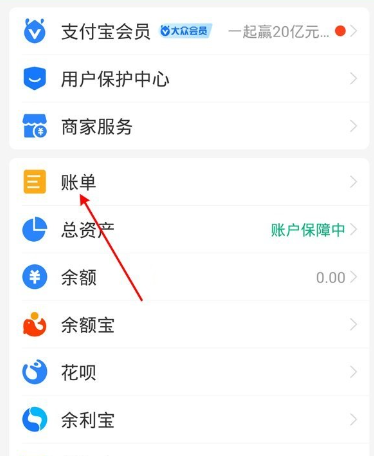 第二步:切换到账单页面,找到余额宝支付,点击;