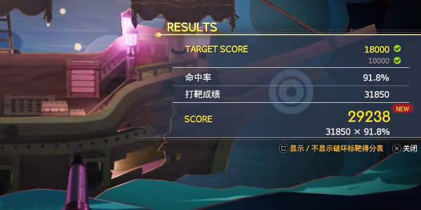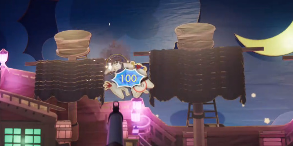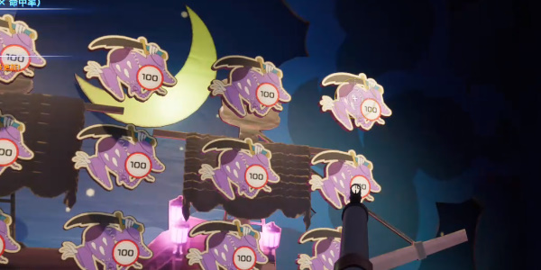 4、第二回合开始,先打猪怪,瞄准左边的破木屋。当第二个鬼升到空中并出现音效时,瞄准最右边,然后向左拉,粉碎出现的怪物;