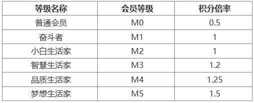 消费金额*会员等级积分倍数=积分。不同级别会员的积分乘数如下: