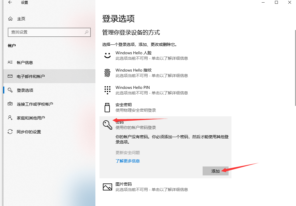 第四步:切换到账户页面,找到左侧【登录选项】并点击;