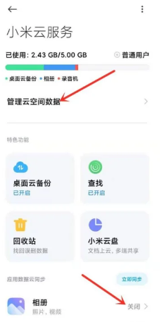 第四步:在最新的小米云服务页面,点击【管理云空间数据】,然后点击【相册】后面的关闭;