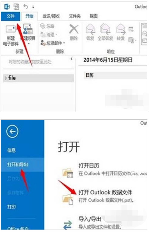 3. 打开Outlook 后,单击“文件”菜单栏,然后选择“打开Outlook 数据文件”。