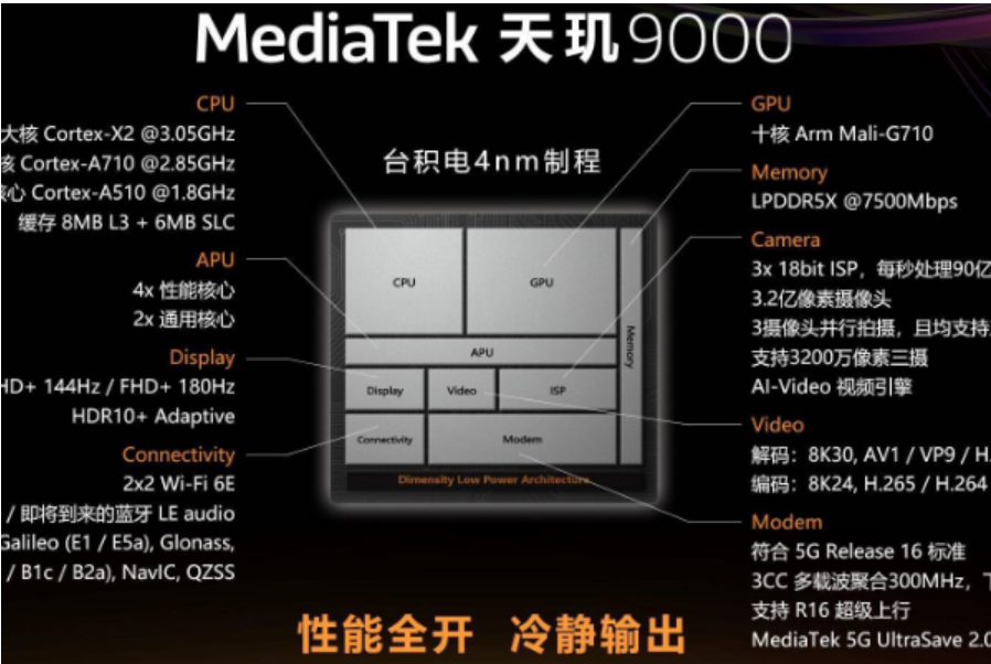 天玑9000采用台积电4nm工艺,先进的1+3+4三丛集旗舰架构。 1Arm Cortex-X2超大核心@3.05GHz爆发惊人峰值性能,满足旗舰手机高性能需求; 3Arm Cortex-A710大核@2.85GHz,让重载应用和多任务处理更加高效; 4Arm Cortex-A510能效核心@1.8GHz,低功耗处理轻量级任务。 4MB超大容量缓存组合,由6MB系统缓存和8MB三级缓存组成。率先支持LPDDR5X内存,传输速率高达7500Mbps,适合5G高速网络下的应用数据传输,是新一代旗舰手机的标准配置。支持双通道UFS3.1闪存,加速全场景应用。