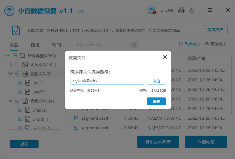 5. 设置恢复文件的保存路径后,单击“确定”。