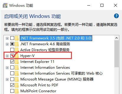 4、“Windows功能”窗口后,等待一会儿,等加载好后,在“Hyper-V”文件夹前的复选框前打勾选中,打勾选中表示启用此功能。然后,点击“确定”按钮即可;