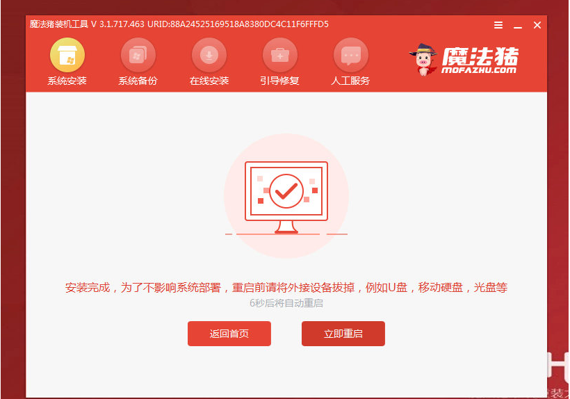 5、耐心等待安装完成,拔掉U盘并重新启动电脑。
