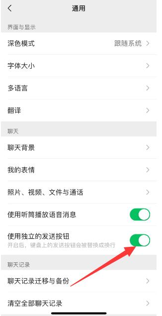 第四步:在通用页面,您可以看到底部【使用单独的发送按钮】后面的按钮,将其滑动到绿色。