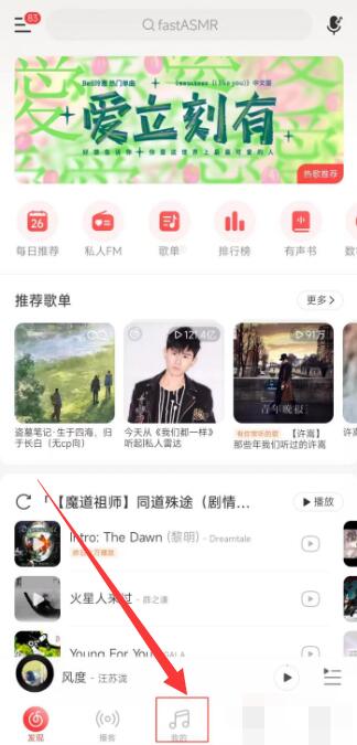 第一步:打开网易云APP,进入首页,选择【我的】区域,如下图箭头所示;