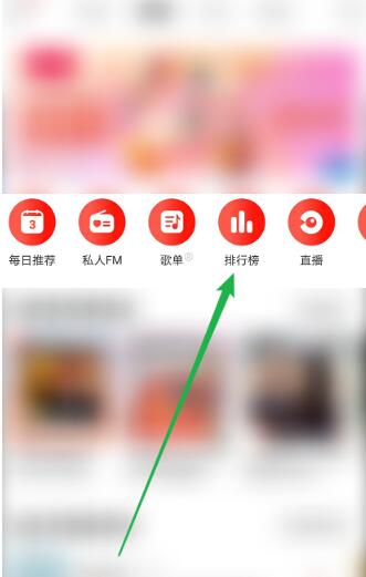 第二步:进入网易云音乐首页,点击下图箭头所示的【排行榜】;