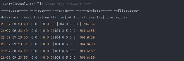 如想监控 swap,process,sockets,filesystem 并显示监控的时间:
