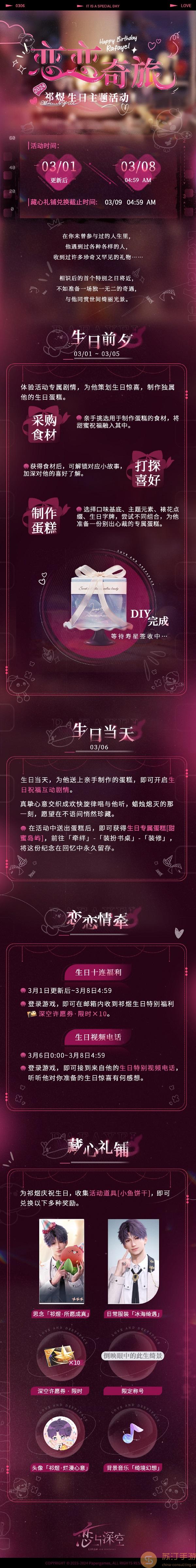 3月1日~3月8日4点59分更新后,登录游戏即可在邮箱中免费领取“深空许愿券限时*10”生日加成奖励!
