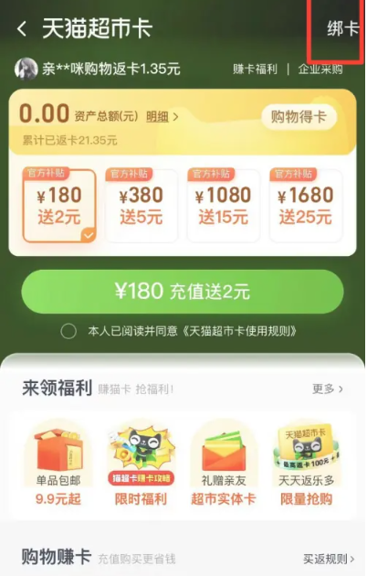 3、然后跳转到天猫超市卡页面,点击右上角【绑定卡】;