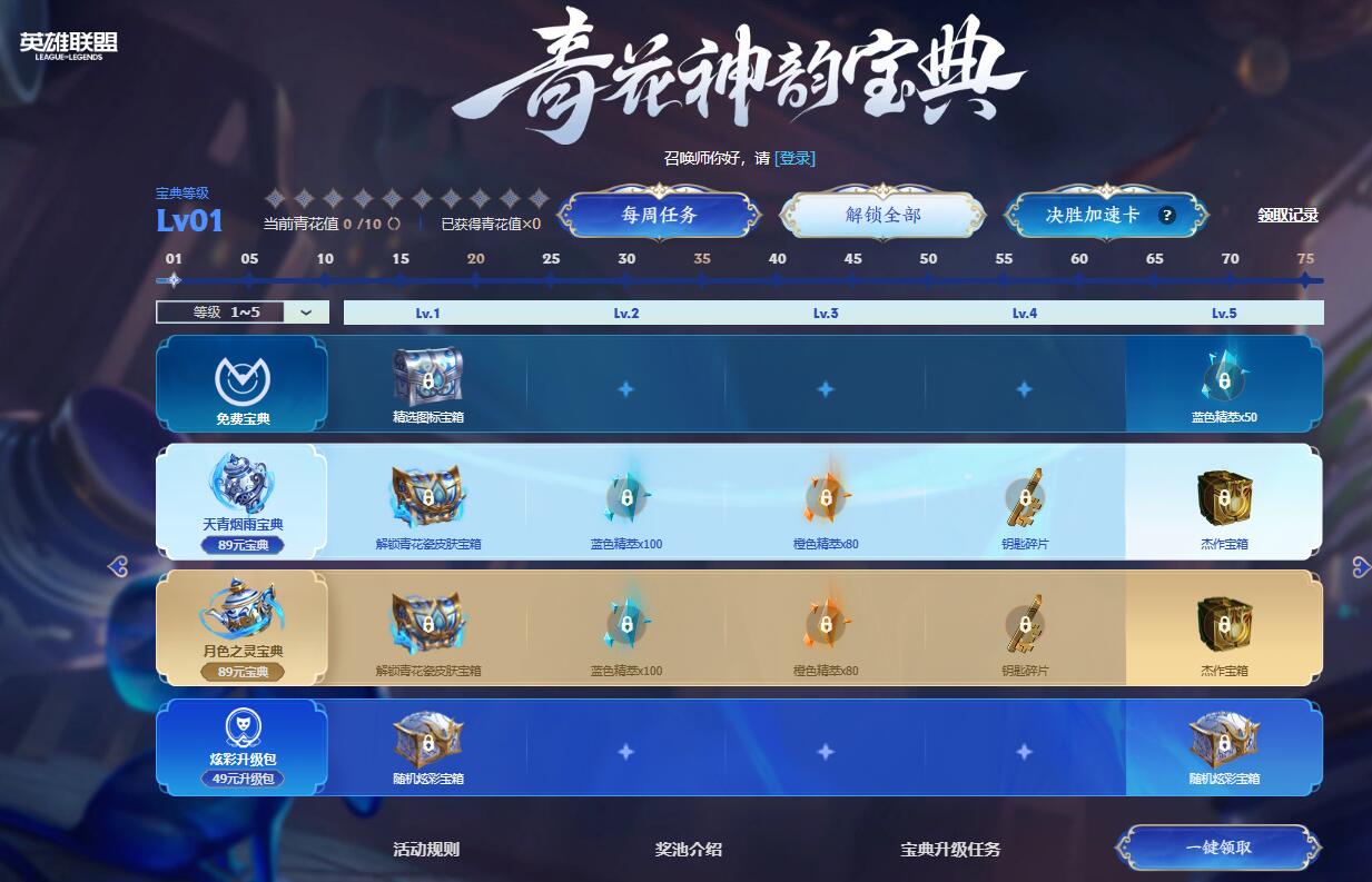 解锁书本并完成任务以提高书本的等级。共获得随机神话皮肤宝箱1个(打开后将显示优先奖池中随机出现的皮肤已发布1年以上的3个。奖池中没有Hex/Premier系列皮肤。玩家可以任选一款领取,如果领取时已经拥有奖池中的所有皮肤,则将获得125神话精华)、全新青花瓷史诗皮肤1个、传奇皮肤宝箱1个(无皮肤)优先奖池中解锁)、随机皮肤宝箱1个(优先奖池中未解锁皮肤)、盲盒11个、神话精华25个、杰作宝箱5个、海克斯科技神秘表情5个、1900蓝色精华、1550橙色精华和15 个海克斯科技钥匙碎片。