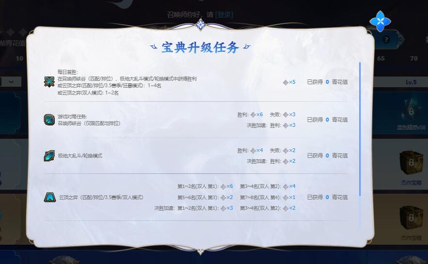 赢得召唤师峡谷(匹配/排名)或ARAM/轮换模式:完成第1~2 名,或完成第1~ 名云顶之弈(匹配、排名、第3.5 赛季、狂暴模式)第4 名、第1~2 名010- 63015(双倍模式),奖励5蓝白。
