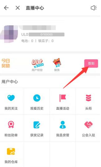 2、最后在直播中心界面,点击下图箭头所示的【签到】按钮,即可完成日常签到。