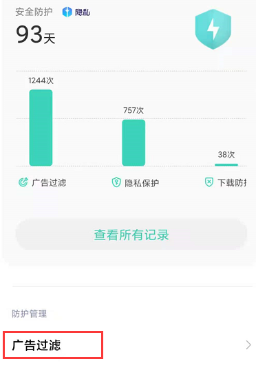 4、然后在如下图的防护管理页面,点击【广告过滤】;
