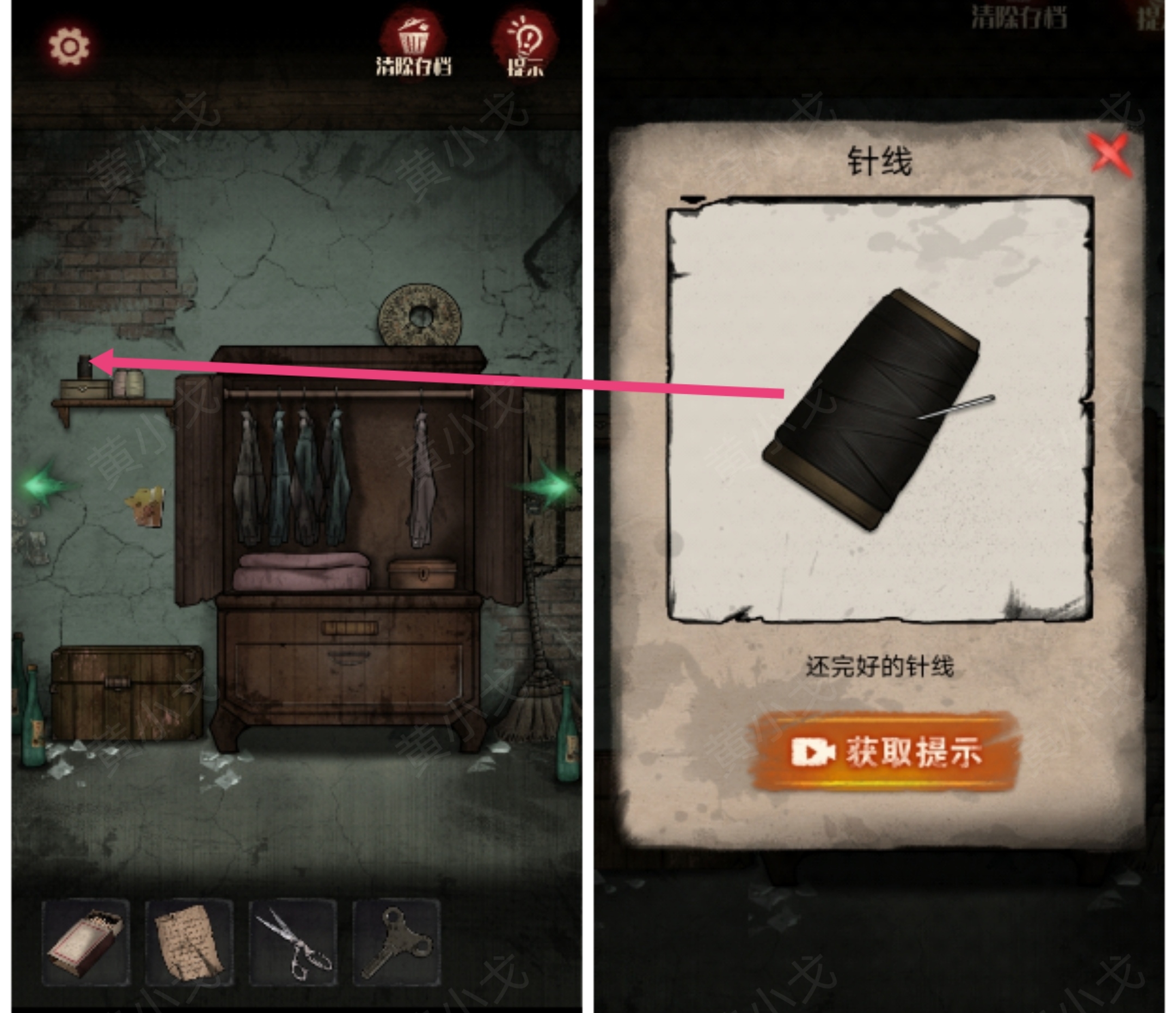 12.点击床上的布娃娃,用【针线】将其缝起来,获得线索(6372)