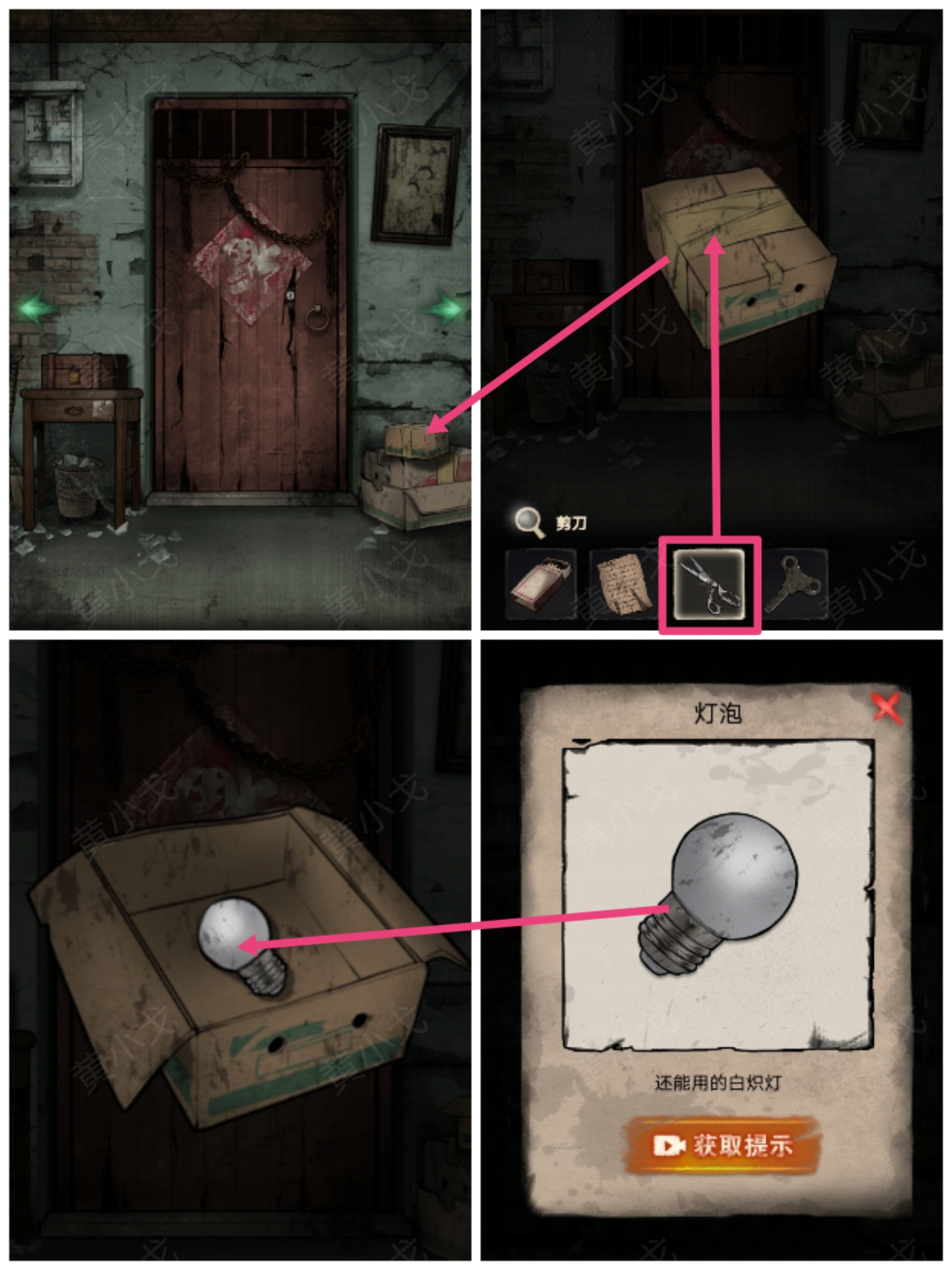 5.(门)点击盒子,使用【剪刀】剪断胶带;打开盒子并获得[灯泡]