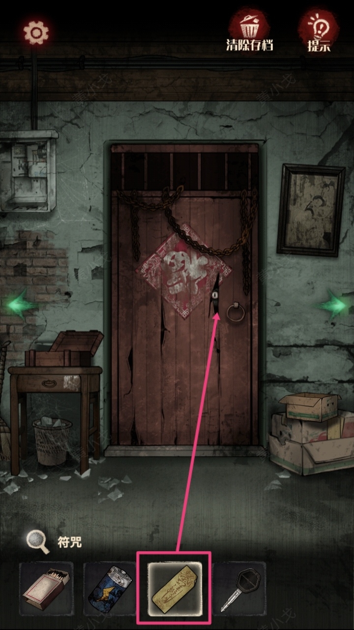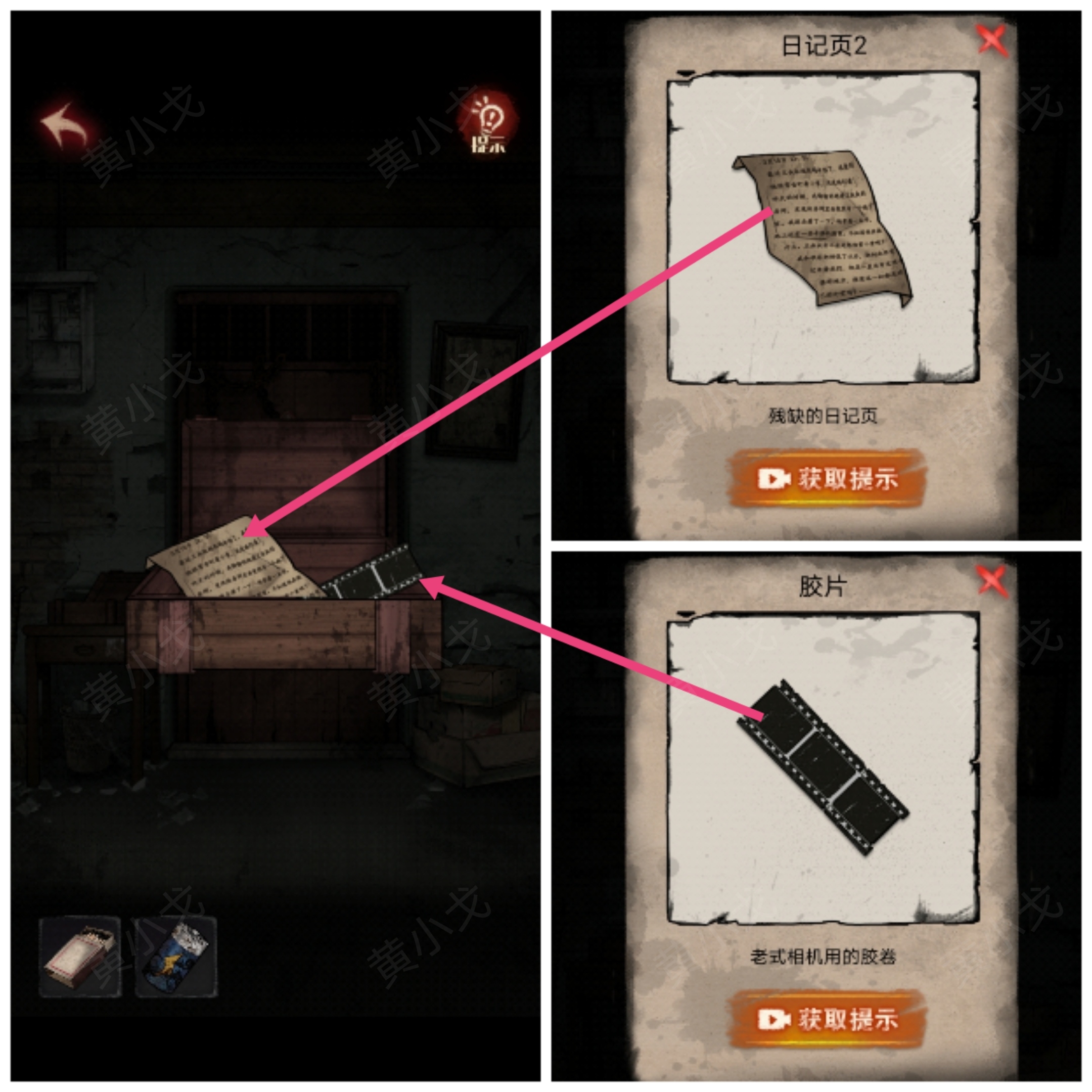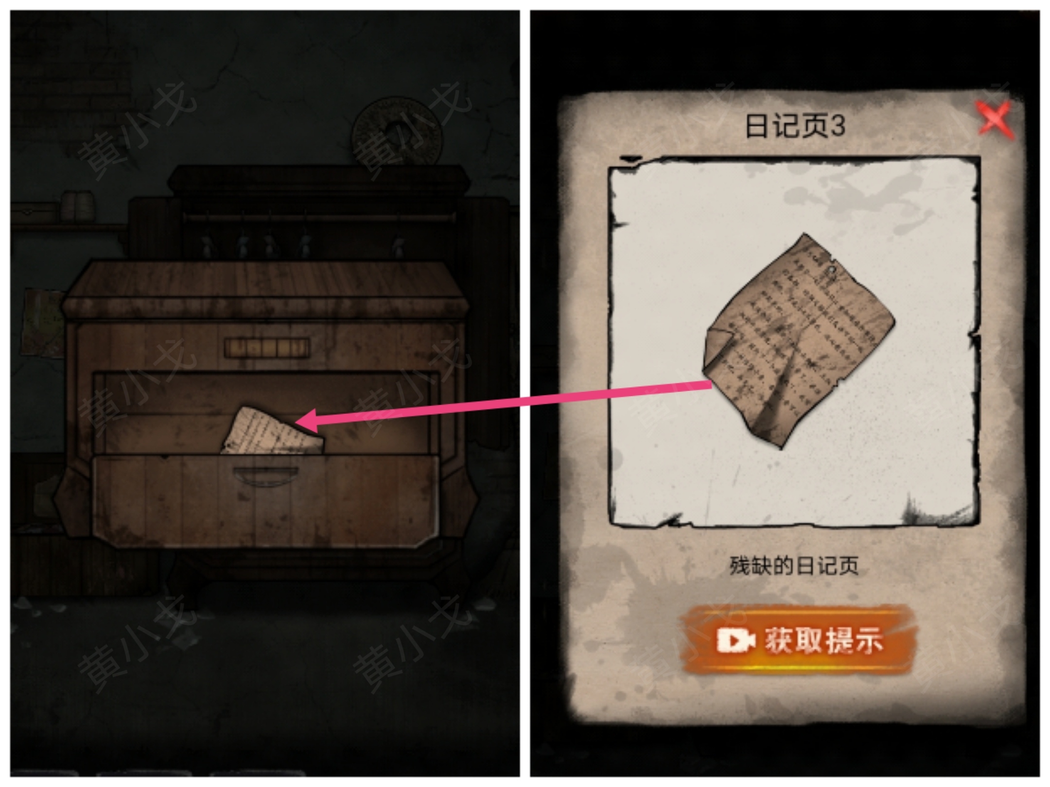 24.(书柜)点击书柜上的日记,放入【日记第3页】,在下一页获得【咒语】