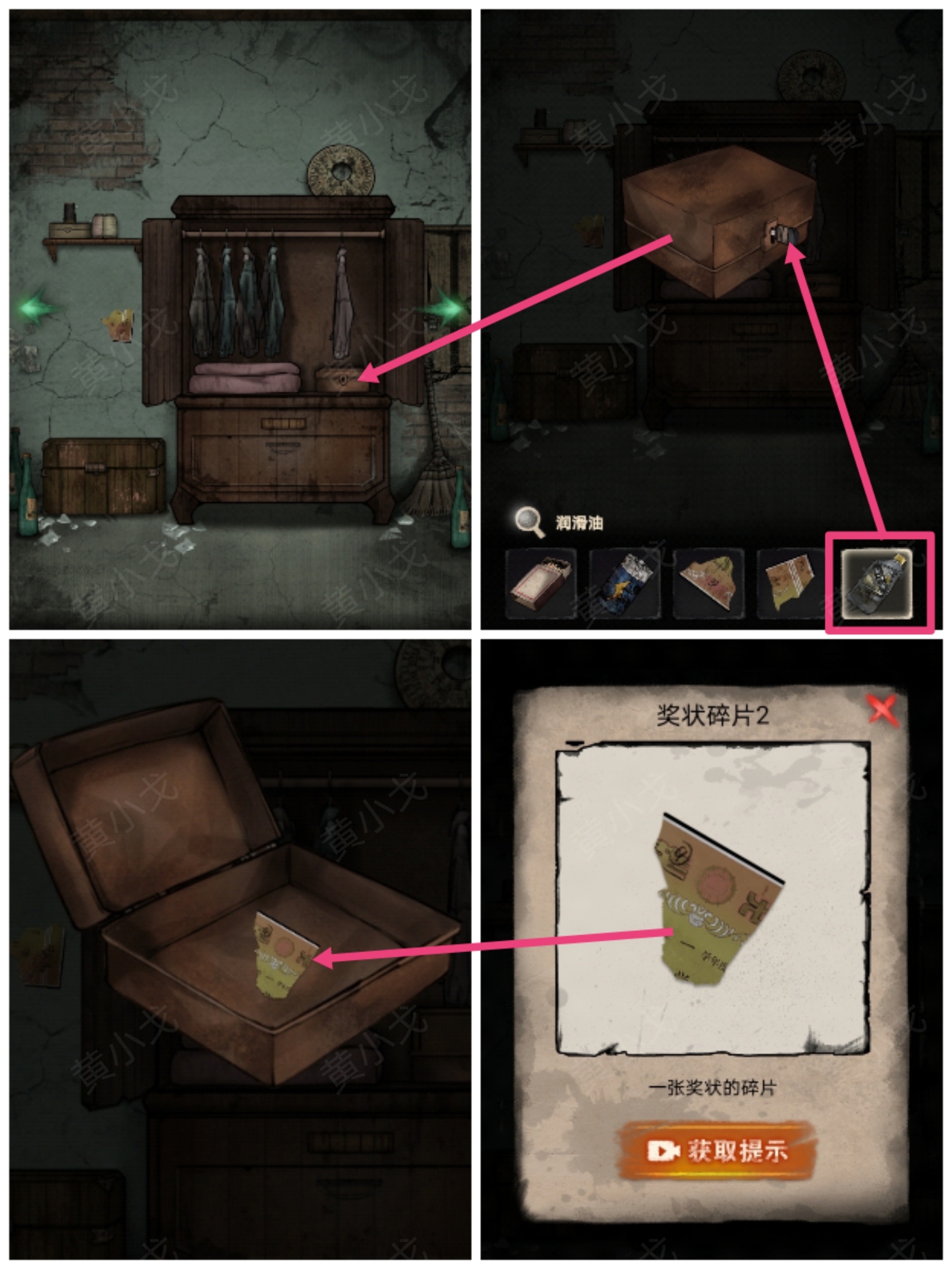 18.(衣柜)点击衣柜内的箱子,使用【润滑剂】;打开盒子,获得【证书碎片2】