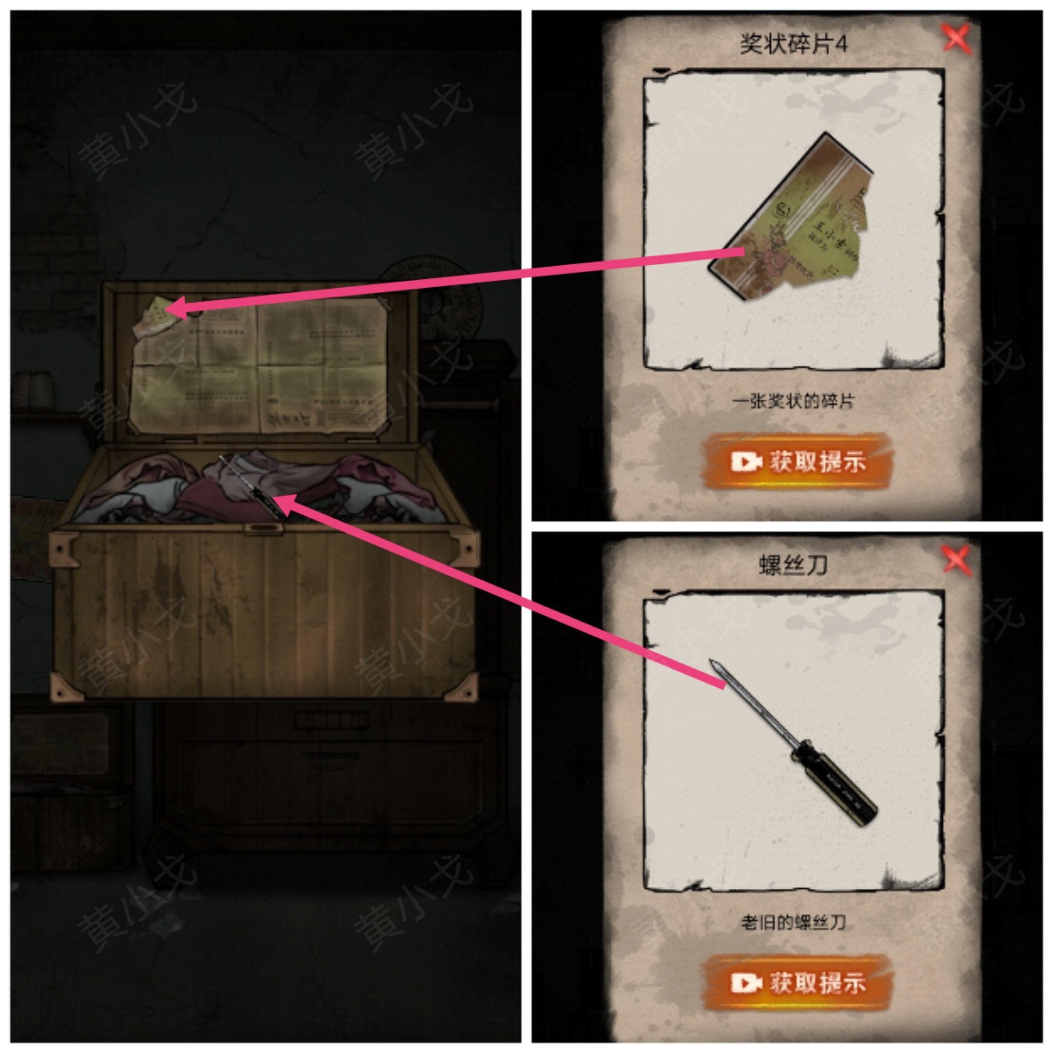 9.(床)点击柜子上层抽屉,用【血红钥匙】打开,获得【证书碎片3】