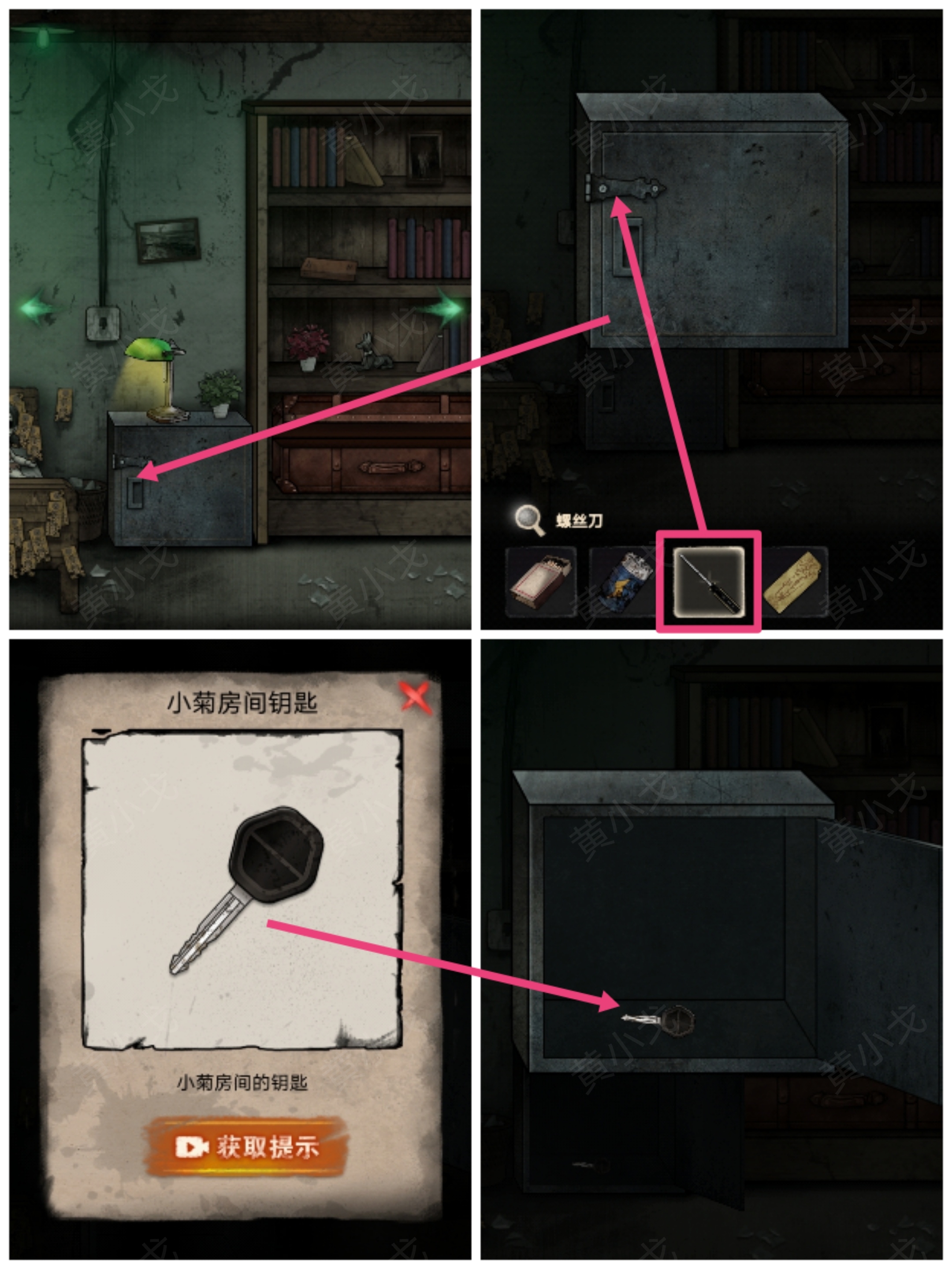 25、点击保险箱,使用【螺丝刀】拧下螺丝;打开保险箱,获得【小菊房间钥匙】