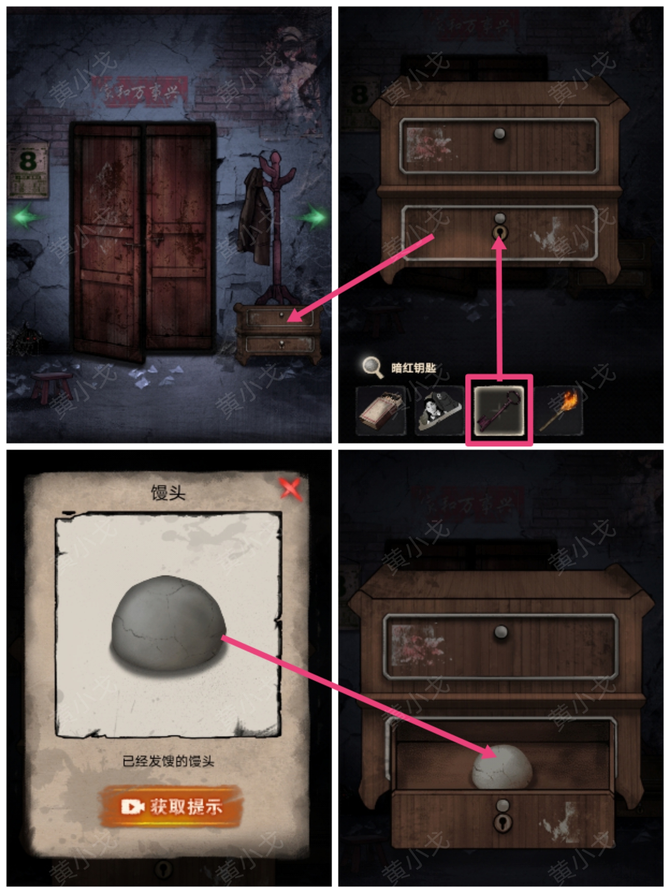 8.(门)点击柜子下层抽屉,用【深红色钥匙】打开,获得【包子】