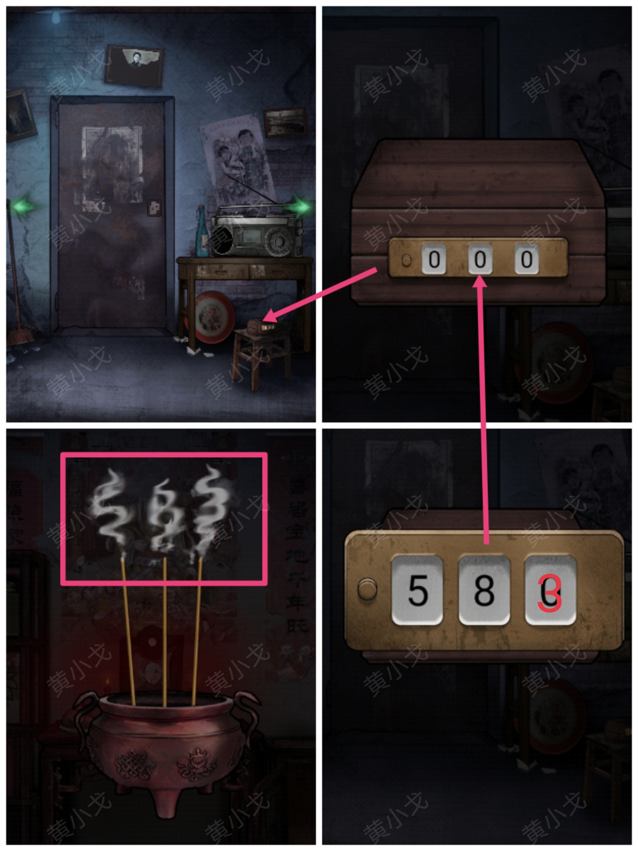12.(铁门)点击凳子上的木箱,根据烧香的线索输入密码:583