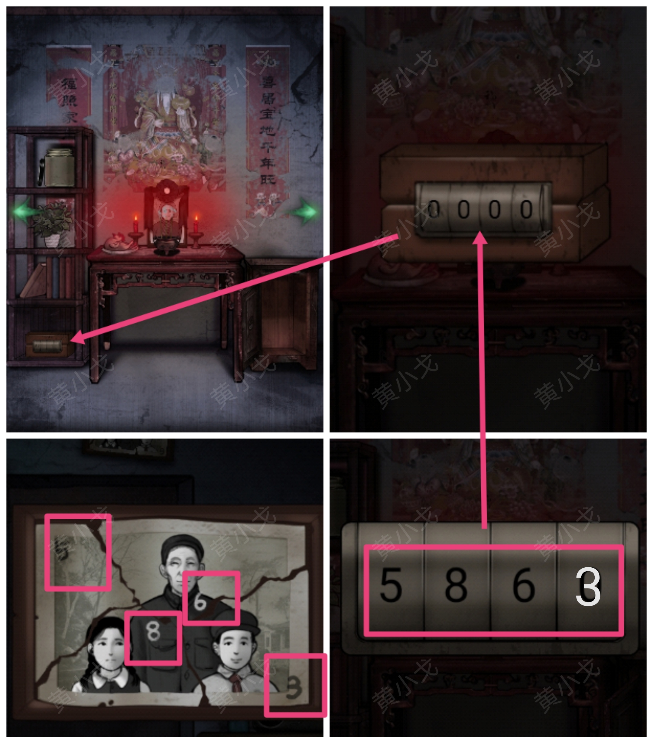 14.点击门上方相框,放入【碎片照片1】、【碎片照片2】、【碎片照片3】;组装一张完整的照片并获得线索(从左到右:5863)