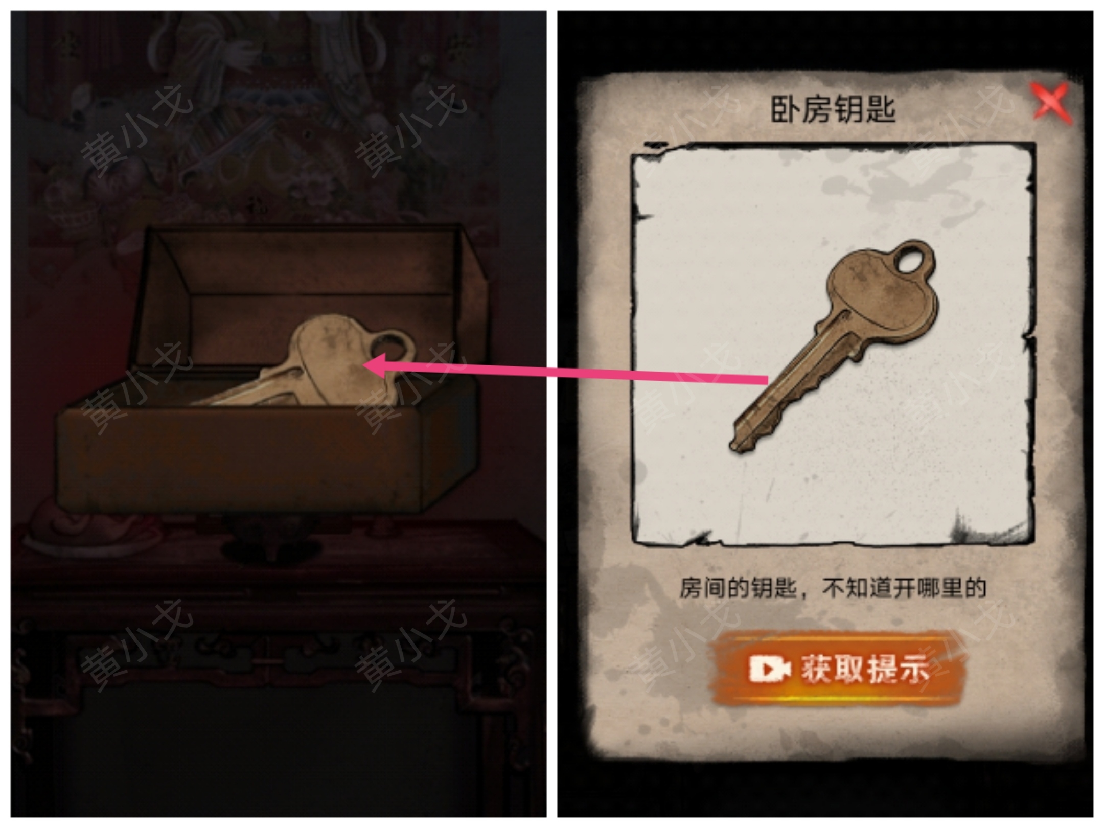 3.(供奉台)点击移动香炉,获得【生锈钥匙】;将【元宝】拿到桌上