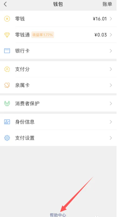 2.然后在钱包功能页面,点击底部的【帮助中心】;