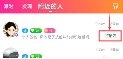 2、然后在附近的人区,如果你找到了你喜欢的用户,点击头像右侧的【打个招呼】;