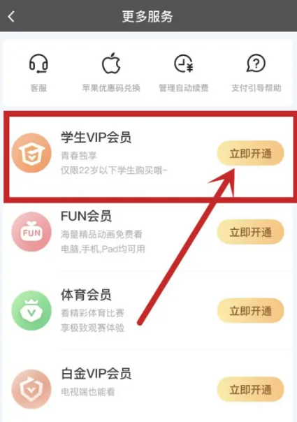 3、最后进入更多服务页面,选择学生会员后面的【立即激活】。