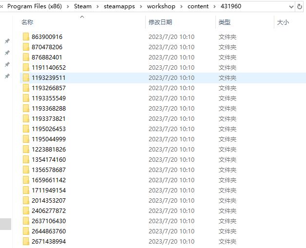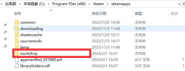 2. 将文件夹位置向前移动到steamapps 文件夹。点击车间